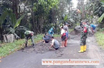 KORAMIL SUKARAJA DIBANTU PEMDES DAN WARGA BERSIHKAN MATERIAL LONGSORAN DI DESA SIRNAJAYA