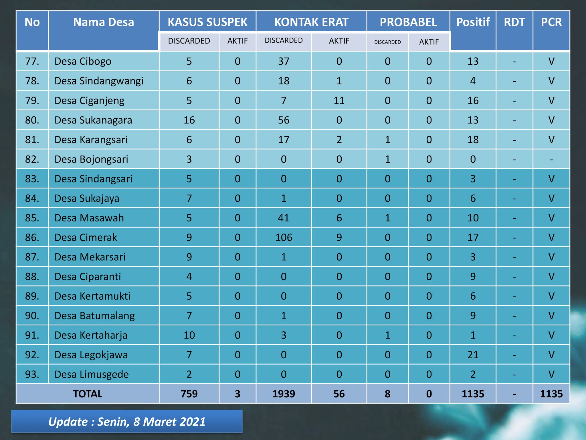 UPDATE DATA COVID-19 KABUPATEN PANGANDARAN PER TANGGAL 8 MARET 2021
